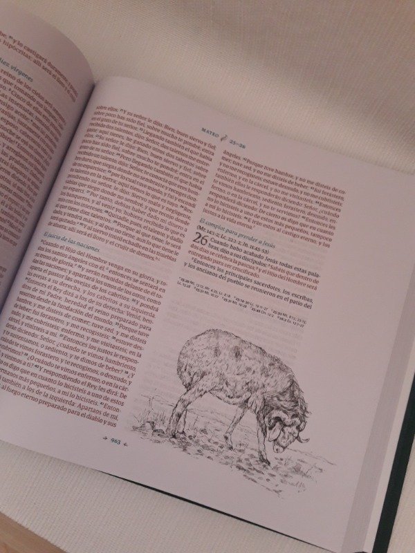 Sumérgete en la belleza de la Palabra de Dios con la RVR 1960 Biblia ilustrada de la creación. Esta hermosa Biblia te ayudará a entender mejor a las personas, la flora y la fauna en el texto bíblico no solamente por medio de espléndidas ilustraciones, sino también por medio de claras explicaciones. El diseño de esta Biblia es especial, pues incluye un margen ancho de 5 centímetros para tus propias anotaciones e ilustraciones. Encontrarás dentro 450 bocetos originales y dibujados a mano sobre la flora mencionada en la Biblia, incluyendo árboles, plantas y flores. Además de eso, los bocetos incluyen animales que aparecen en la Biblia, al igual que 150 personajes bíblicos.